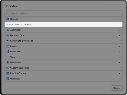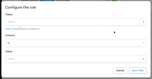 To add a filter to an action, hover over the action and click Filter. In the modal that appears, select A token meets a condition.