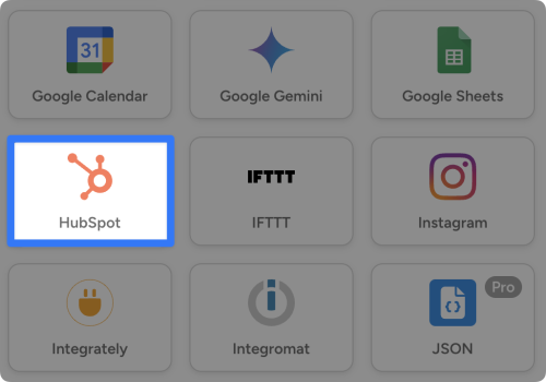 In the Actions panel, click Add action. From the menu of available integrations, click HubSpot or your preferred CRM.