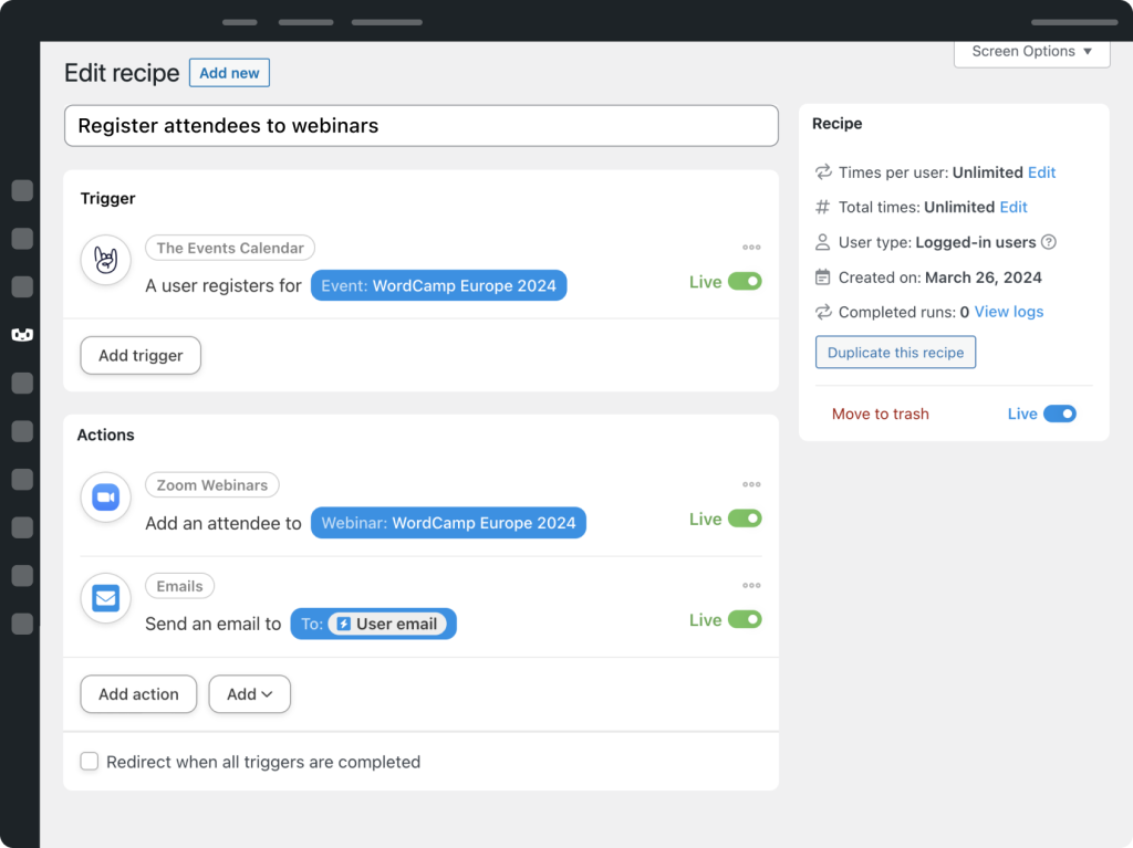 Google Calendar, event management and webinar platforms, automating events and webinars with Uncanny Automator takes only a few clicks.