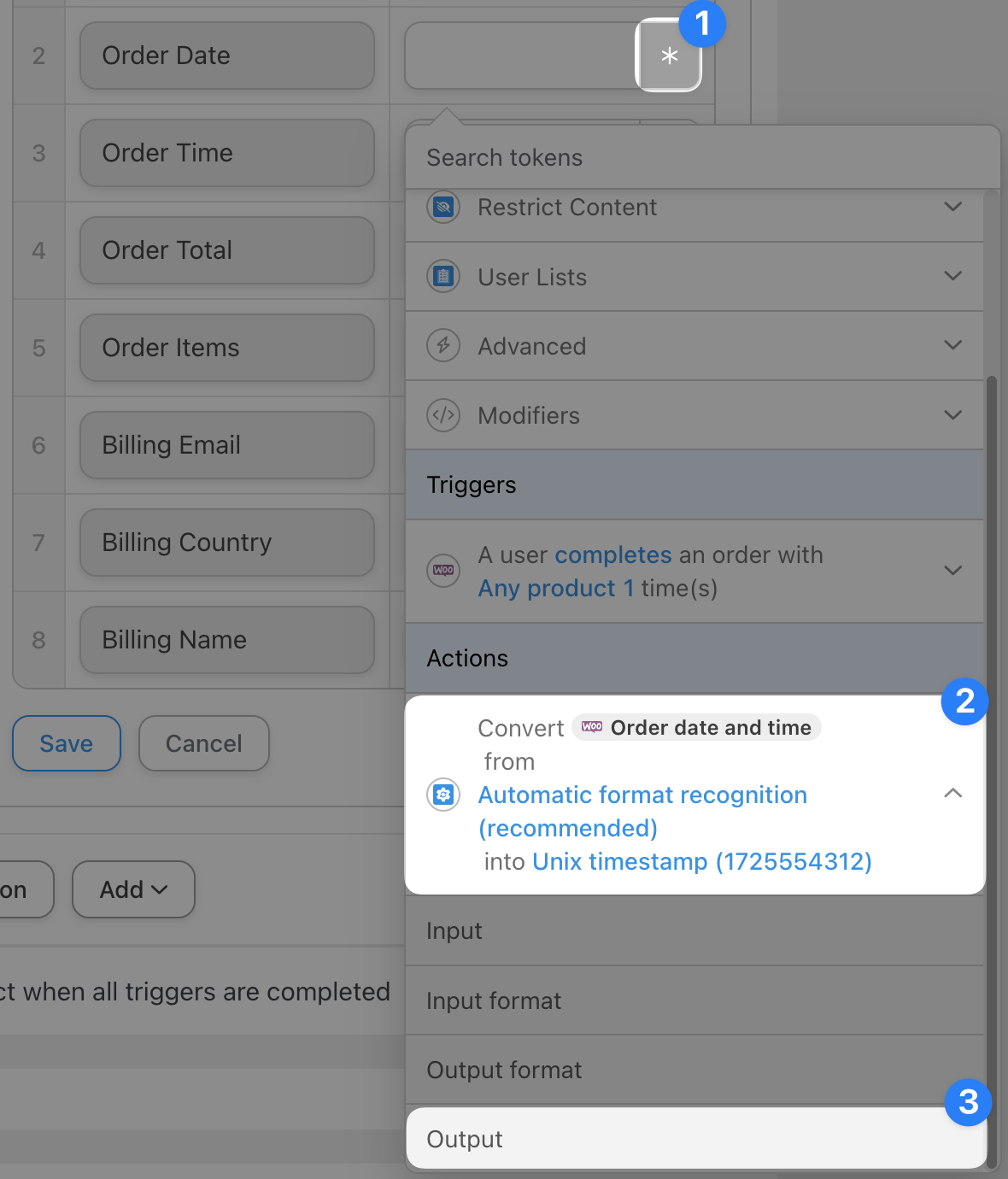 To use a token, click the Asterisk. From the dropdown list, select one of the Woo date and time order tokens.
