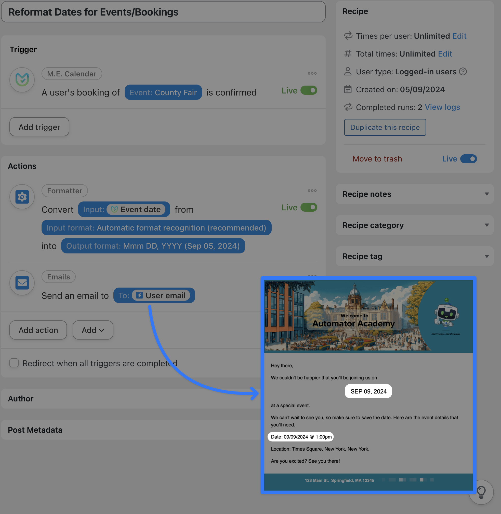 If you’re using an event and/or booking plugin like Modern Events Calendar or Amelia, Automator gives you the ability to reformat dates as you go.