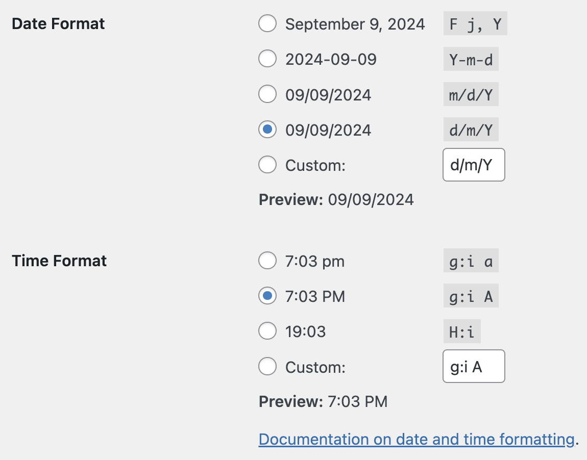 Scroll down to find the sections labeled Date Format and Time Format. WordPress provides several default options for both, but you can also customize your format.