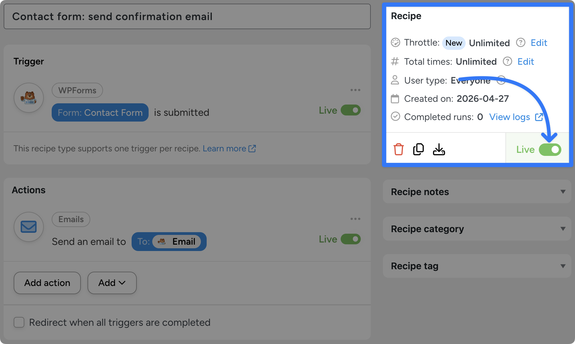 You’re just about to complete your first WordPress automation. In the upper-right of the recipe page, you’ll see a toggle marked Draft. Click it to switch the recipe to Live.