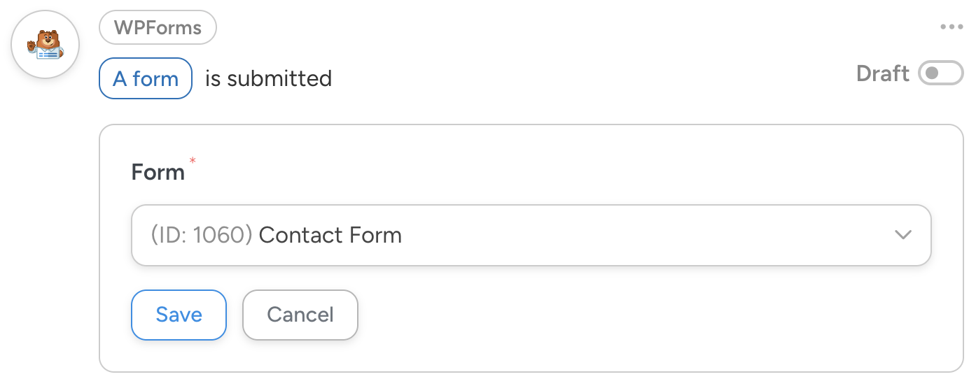 After selecting your form plugin (I’ve selected WPForms), Automator will present you with a dropdown list of available triggers. From this dropdown, select “A form is submitted”.