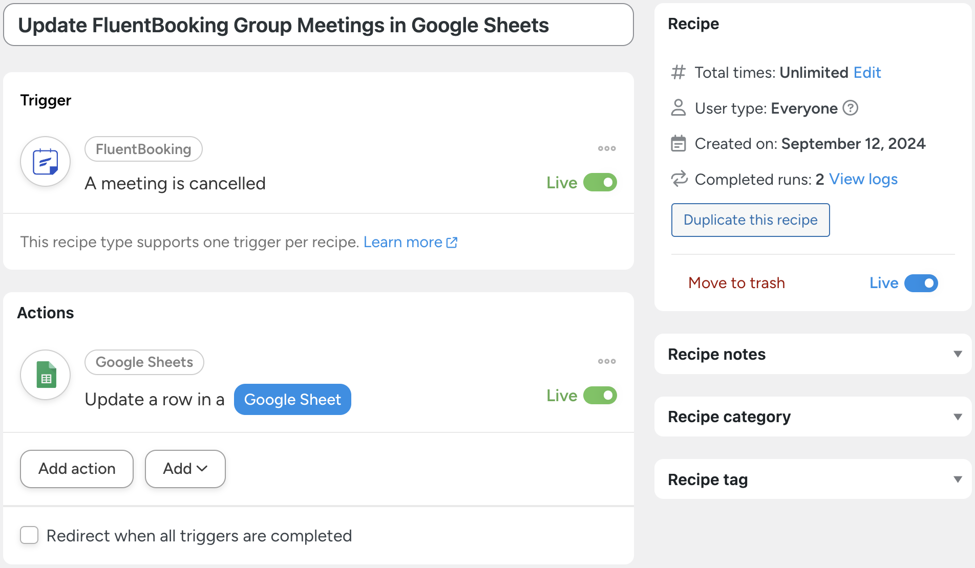 Give your recipe a name that makes it easy to recognize at a glance. For example, we’ve named this recipe “Update FluentBooking Group Meetings in Google Sheets”.