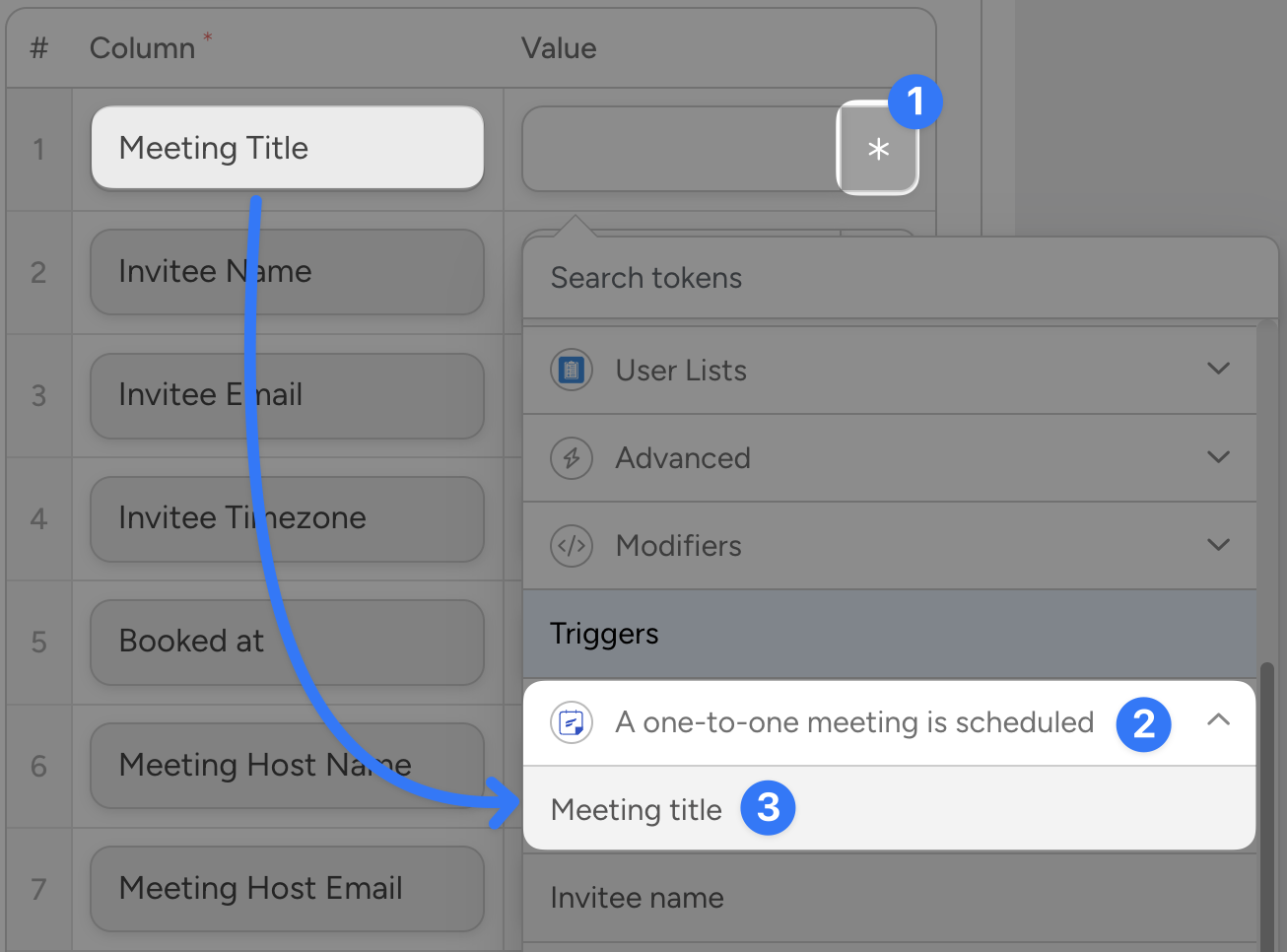 To retrieve a token, click on the Asterisk and select the token that corresponds to the Column. For example, in the “Meeting Title” column, you can add the “Meeting Title” token.