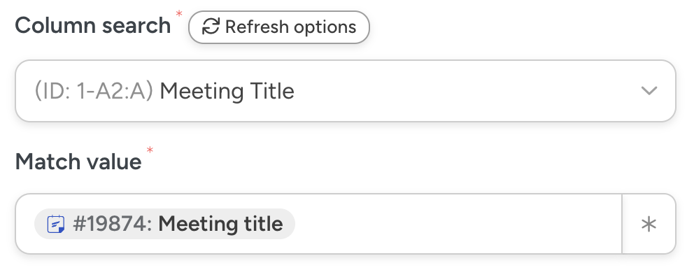 Next, select a column from your spreadsheet. Automator will use this column to match a value of your choice to identify a row to update. For example, we have selected our “Meeting Title” column to match a “Meeting Title” token.