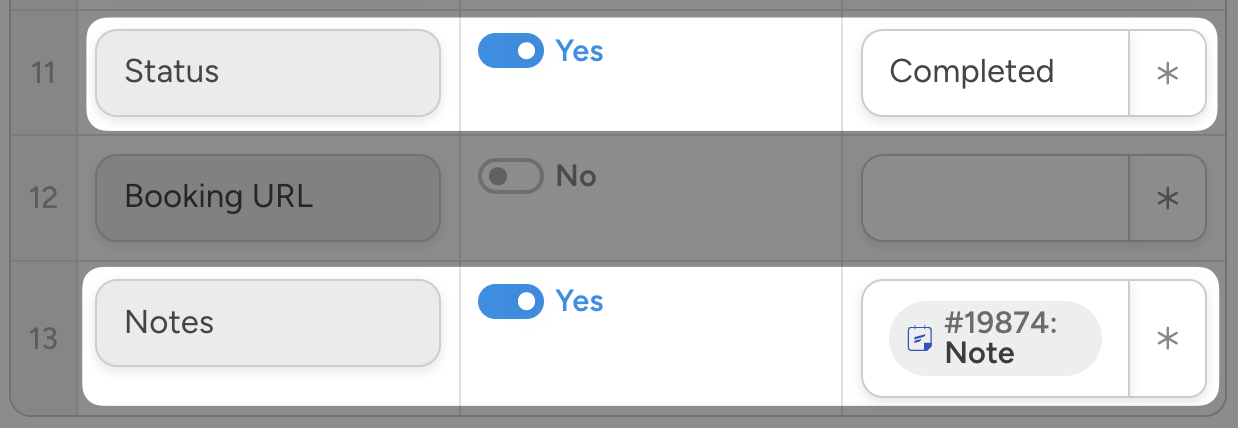 Next, toggle Update from “No” to “Yes” for the row values that you want to update. In our example, we are updating “Status” and “Notes”. You can use a combination of static values and tokens in the Values fields.