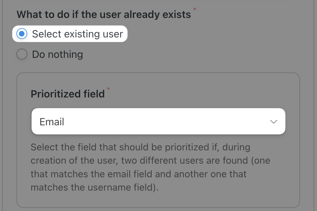 At the bottom of the form, you’ll see a radial with the question “What to do if the user already exists?” Click the radial Select existing user and set the Prioritized field to Email or whichever data point suits your workflows.
