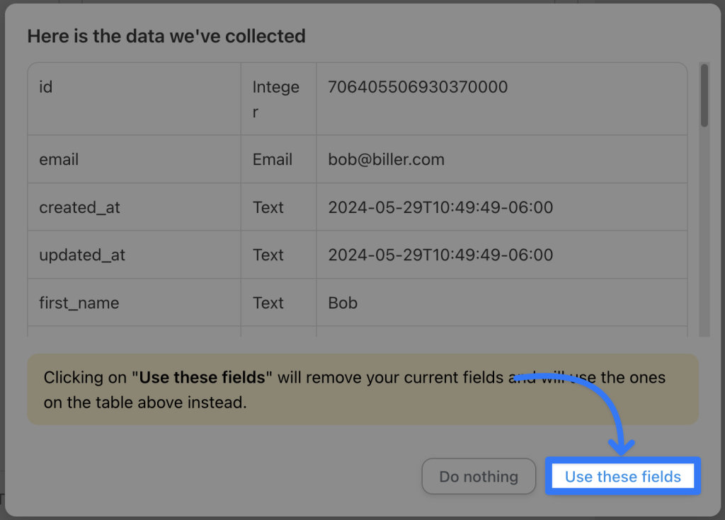 We recommend using the fields from the test results. To do so, simply click Use these fields.