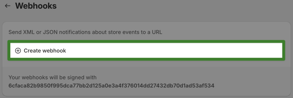 In a new tab in your browser, navigate to your Shopify Store Admin page and click on Settings in the bottom left corner. In the modal that appears, select Notifications and click on Webhooks.