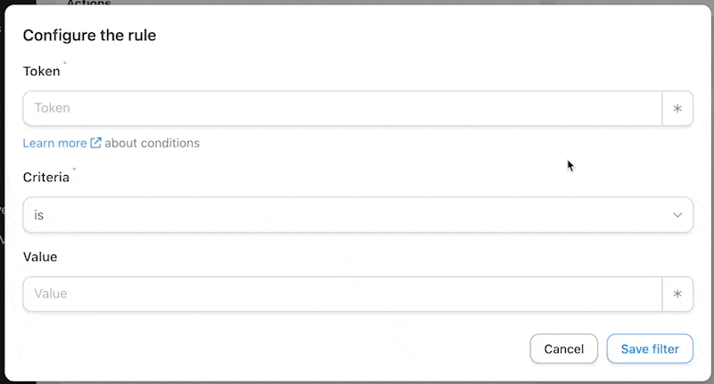 Another modal will appear where you can define the conditions that the token must satisfy for the action to run. Because Shopify produced so many tokens, there are a few ways to define the conditions.