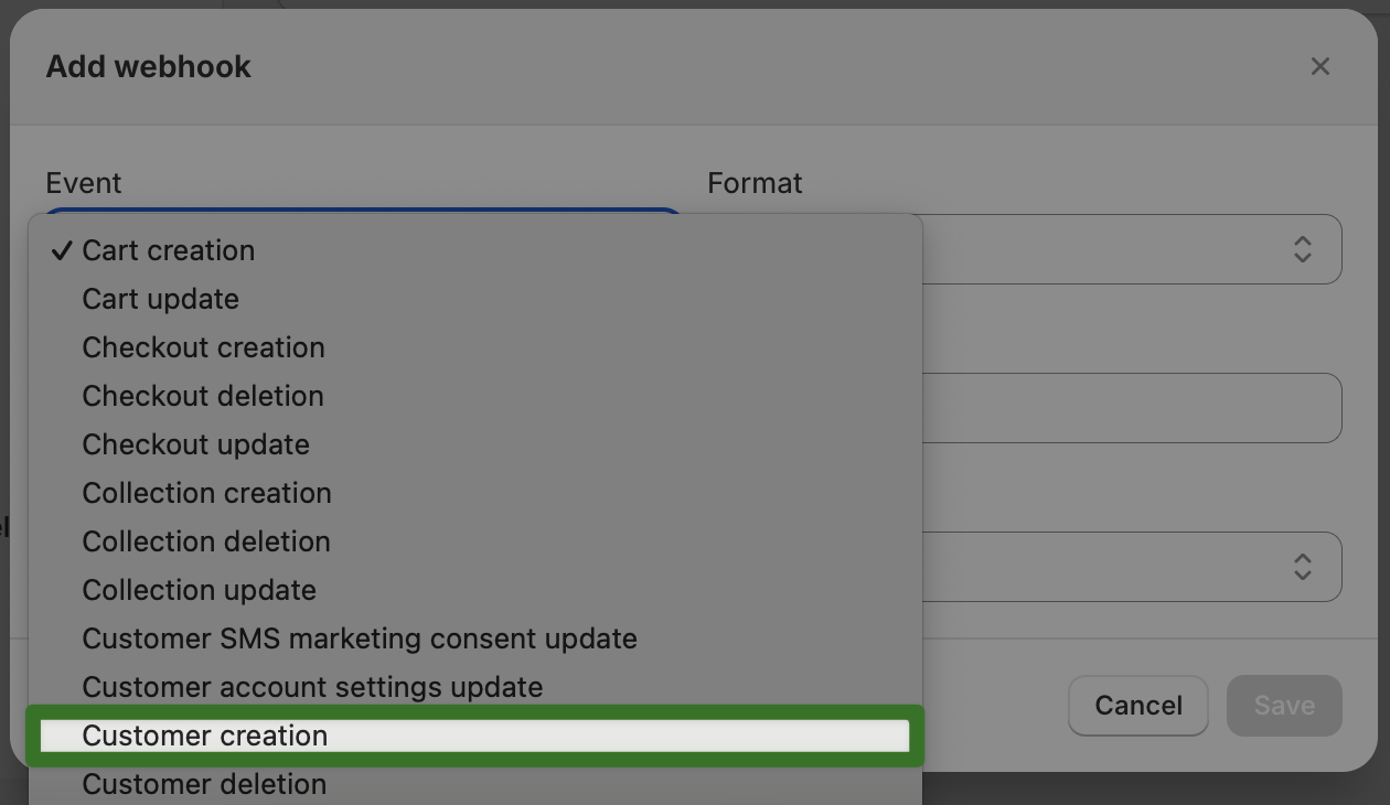 In the new modal, select Customer creation from the dropdown list in the Event field.