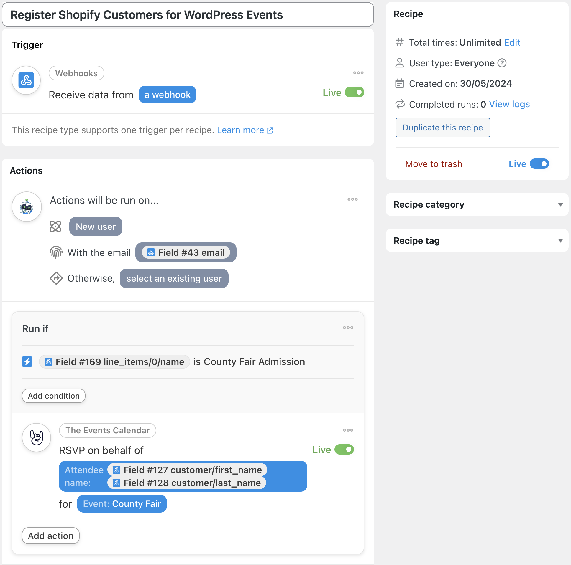 Right now, the recipe would enroll every Shopify customer who placed an order in the LearnDash course that you specified in the action. Needless to say, if you have multiple courses and/or products in your Shopify store, this probably isn’t your intention.