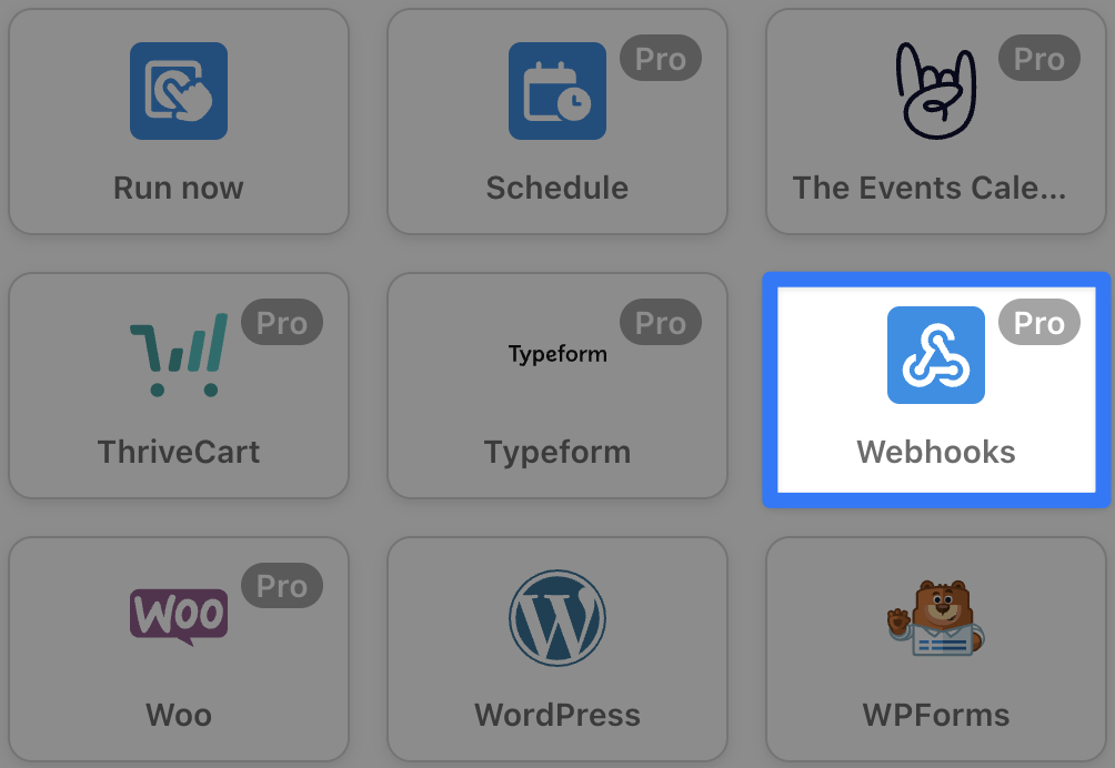 In the Trigger panel, from the menu of available integrations, select Webhooks.