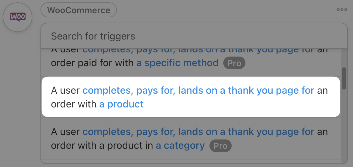 In the Trigger panel, from the menu of available integrations, select WooCommerce. From the drop-down list that appears, select The user completes, pays for, lands on a thank you page for an order with a product.