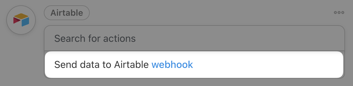 In the Actions panel, click Add action and select Airtable from the menu of available integrations. From the drop-down list that appears, select Send data to Airtable webhook.