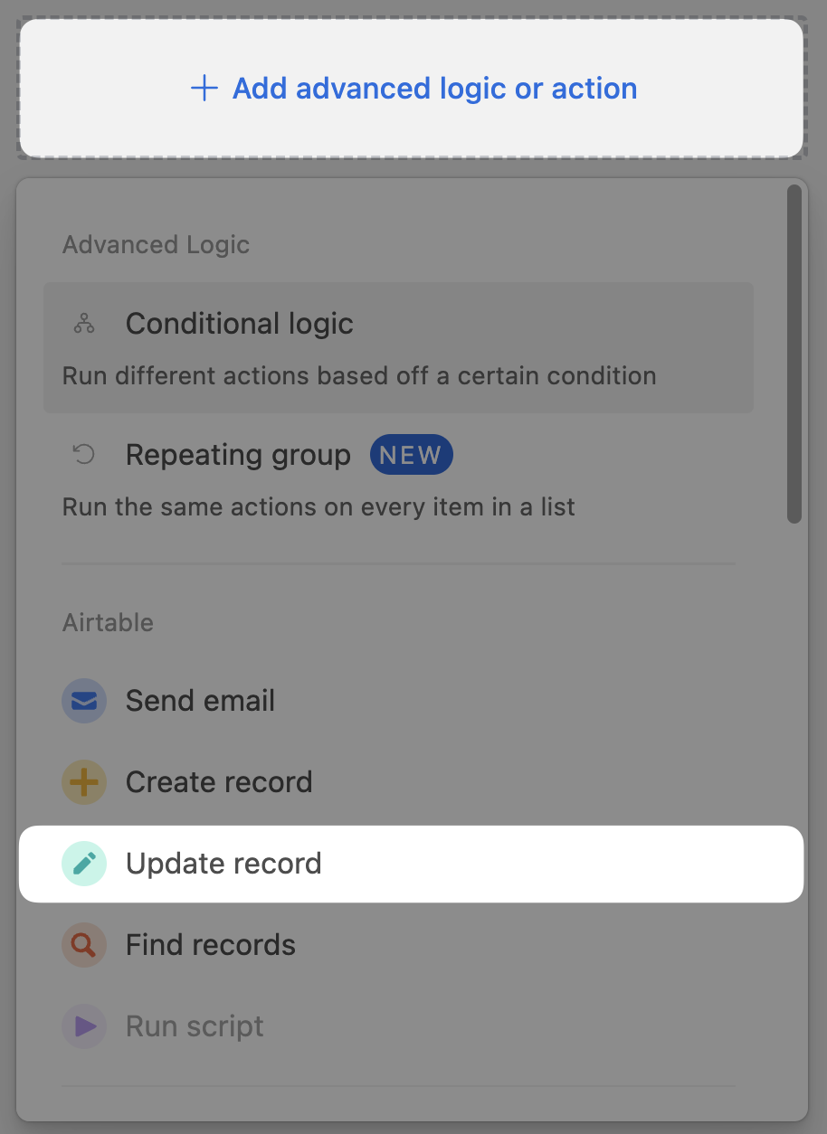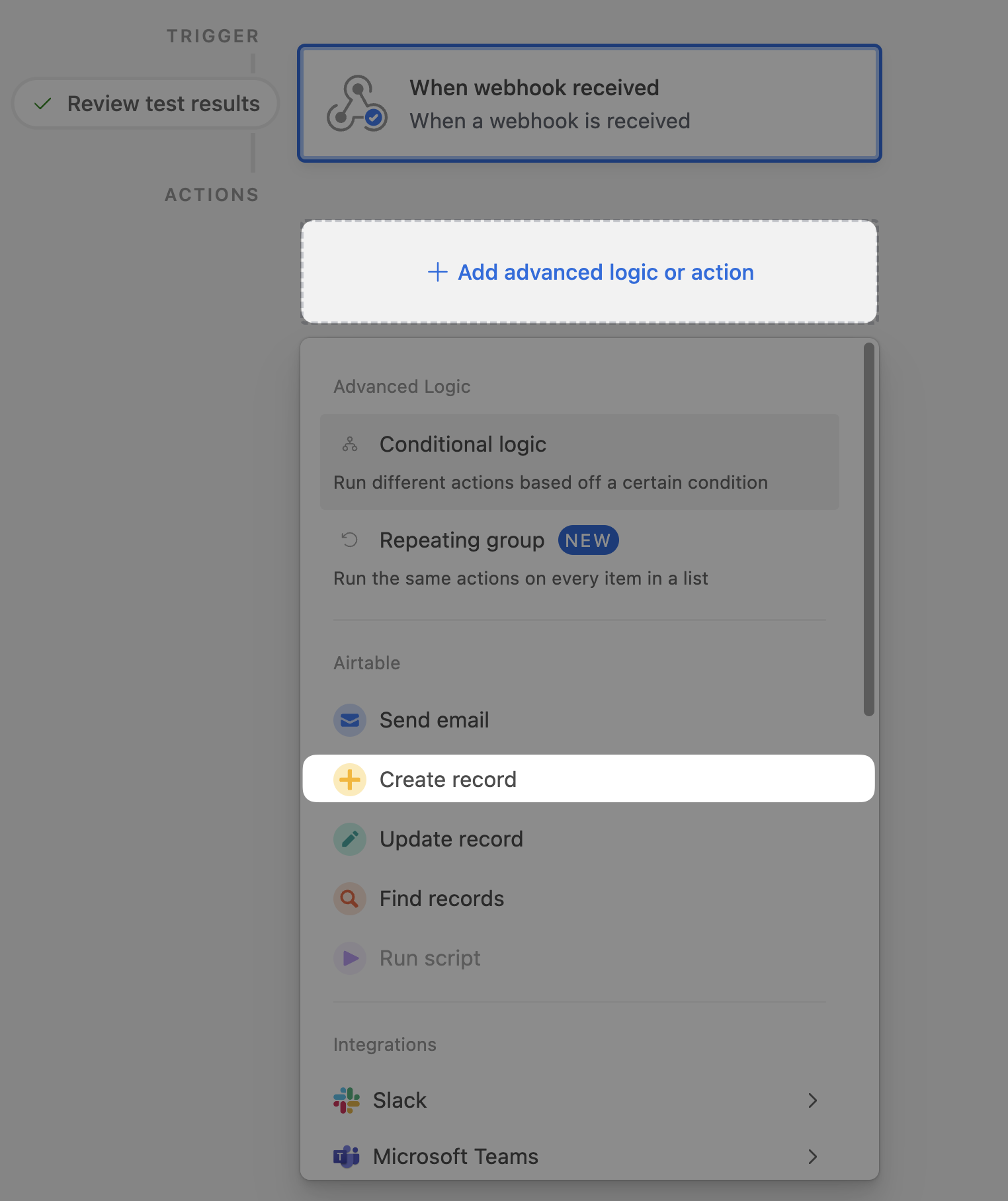 When you’re finished, click Send test. Return to Airtable and click Test trigger. Once the test is complete, add the action Update record.