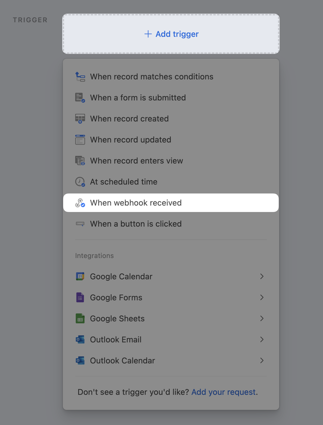 In the top menu bar, click on Automations. Airtable will take you to the Automations screen. Once there, click Add trigger and select When webhook received from the drop-down list.