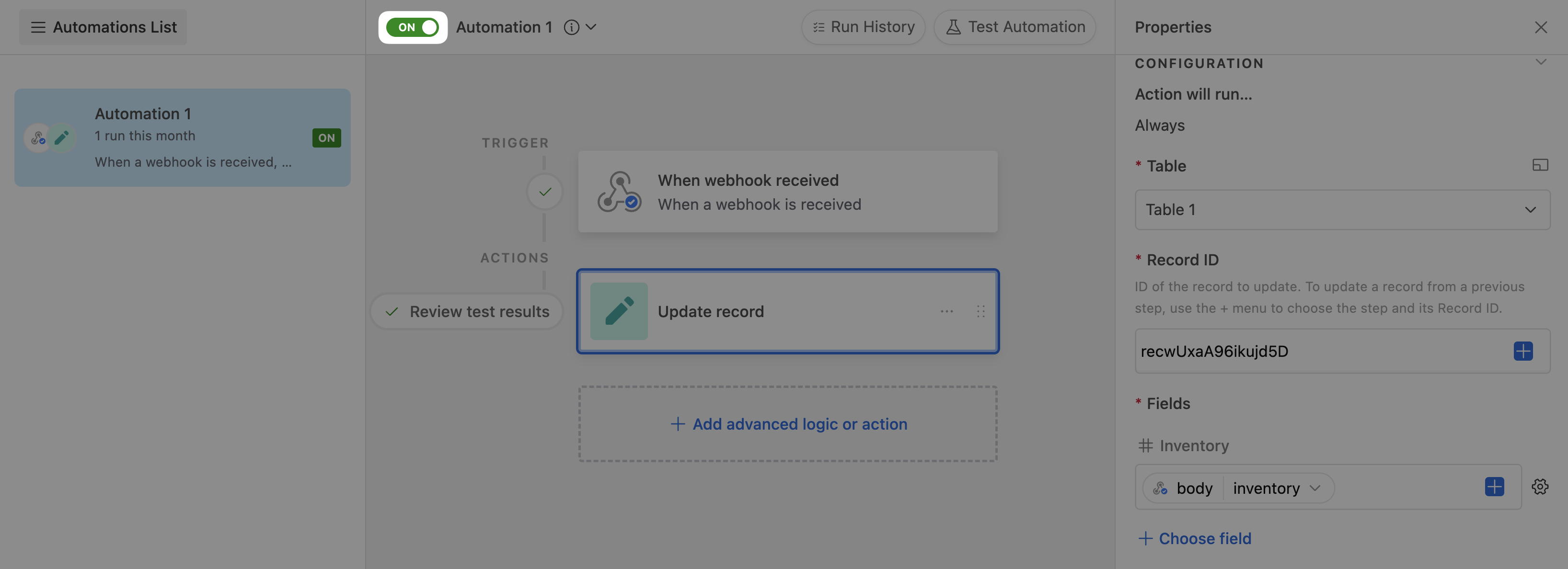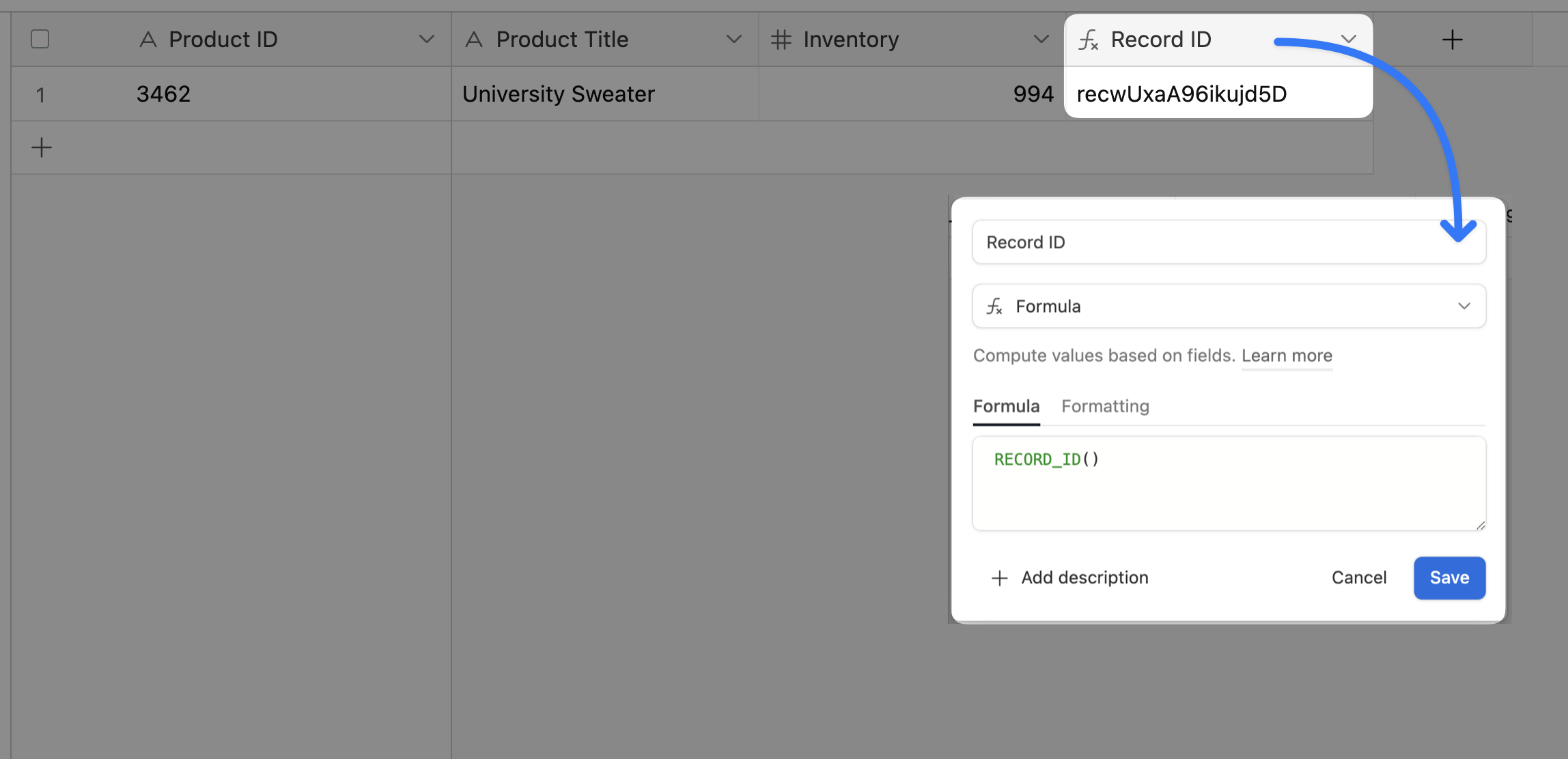 However, we recommend including a formula field that returns the record ID as you will need this information to update values, i.e., inventory, in the Airtable Automation. If you would like to know more about Airtable Record IDs and how to find them, click here.)