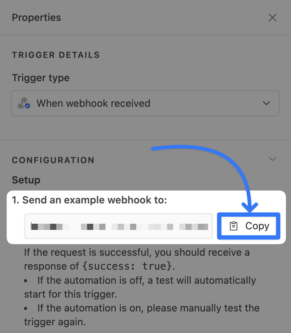 In the Properties panel, on the right-hand side, Copy the webhook URL.