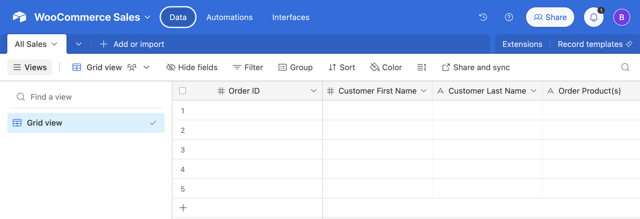 From your Airtable account, open the table where you would like to store your WooCommerce sales. For us, that is our WooCommerce Sales > All Sales table.