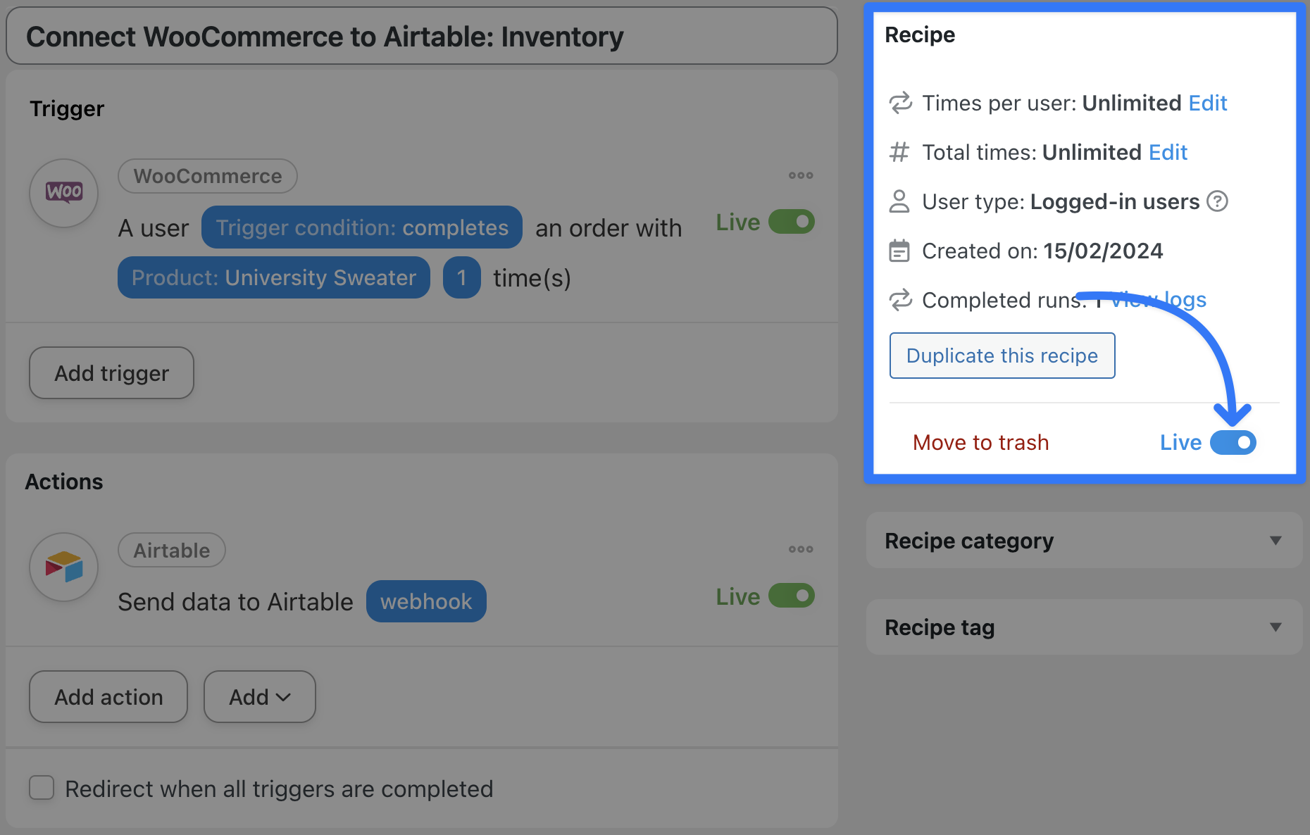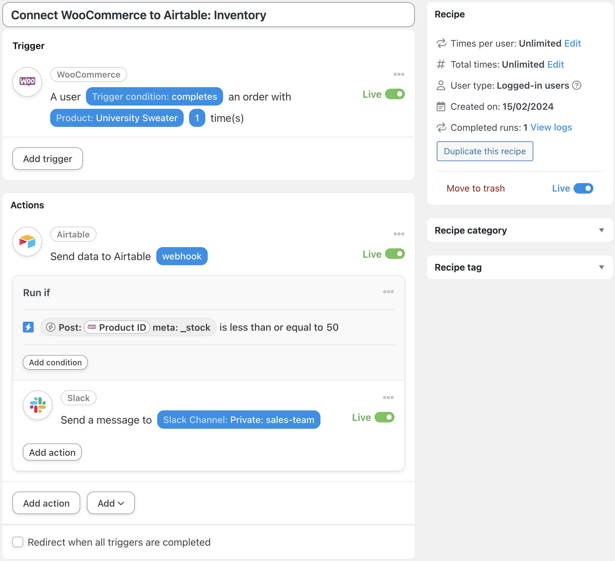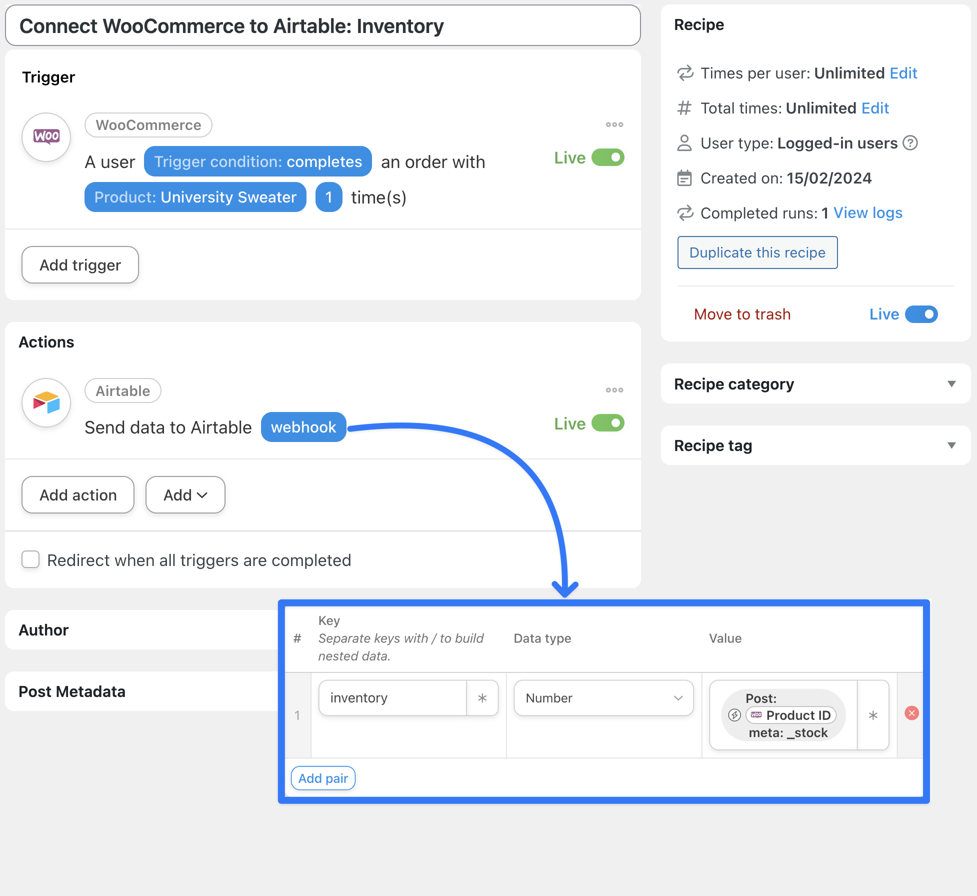 We’ve named this recipe “Connect WooCommerce to Airtable: Inventory”.