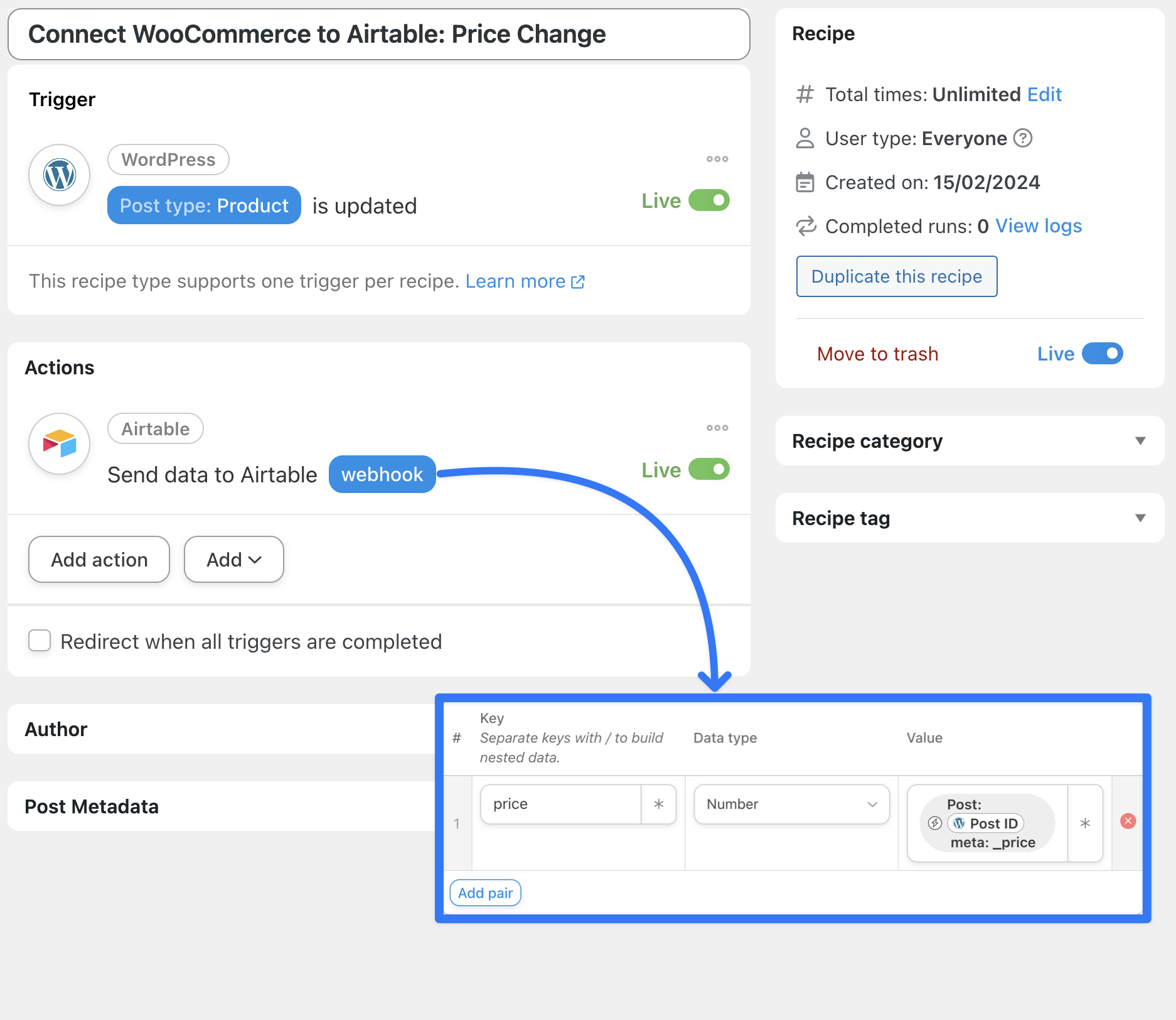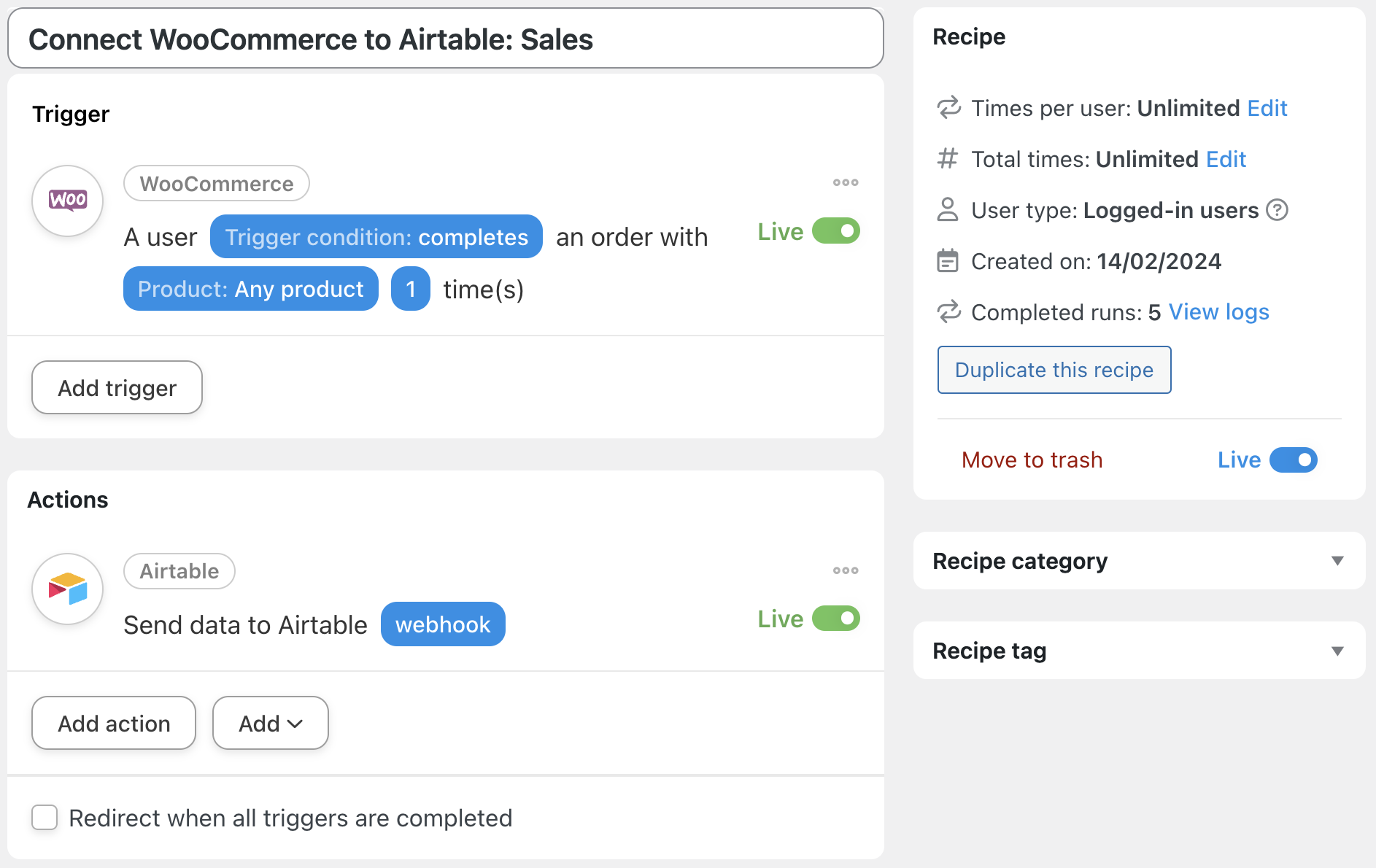With the recipe pictured above, we’re able to update our Airtable records every time one of our customers makes a purchase in our Woo store. Here’s how we did it.