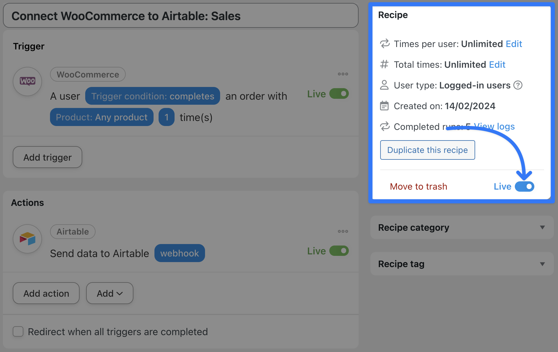 For example, we’ve named this recipe “Connect WooCommerce to Airtable: Sales” based on the integrations involved and the purpose of the recipe.