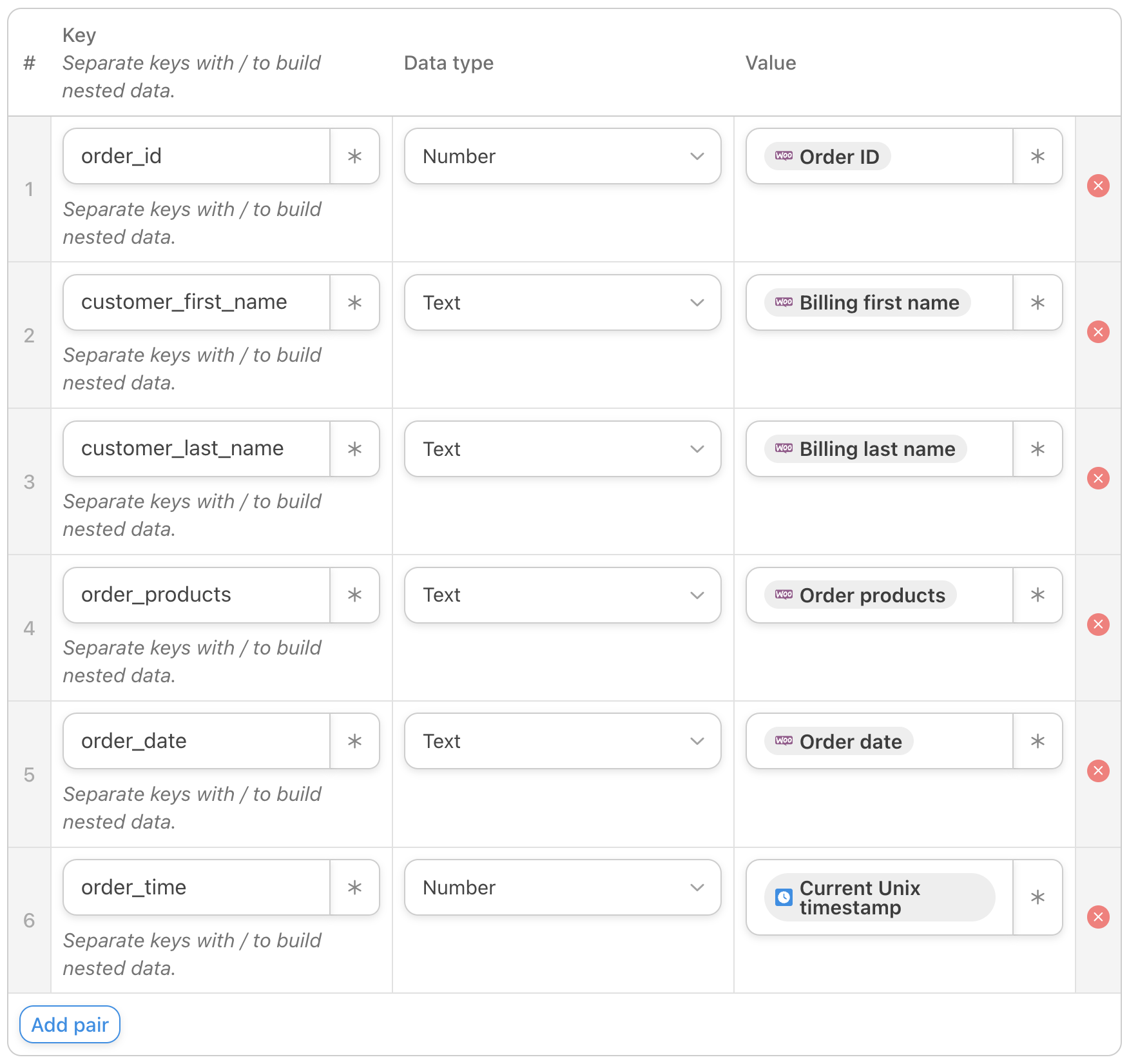Continue adding key/value pairs until you have selected all of the WooCommerce data that you want to send to Airtable.