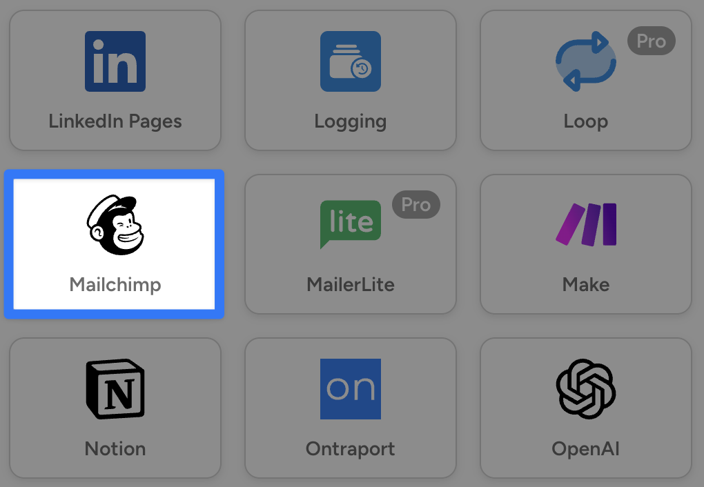 The Uncanny Automator integration selection screen, highlighting the Mailchimp option in white with a blue border.