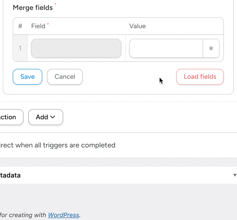 The Merge fields section of the form allows you to fill out the fields in your Mailchimp audience with the information from the Woo trigger and your WordPress website. To retrieve the fields, click Load fields.