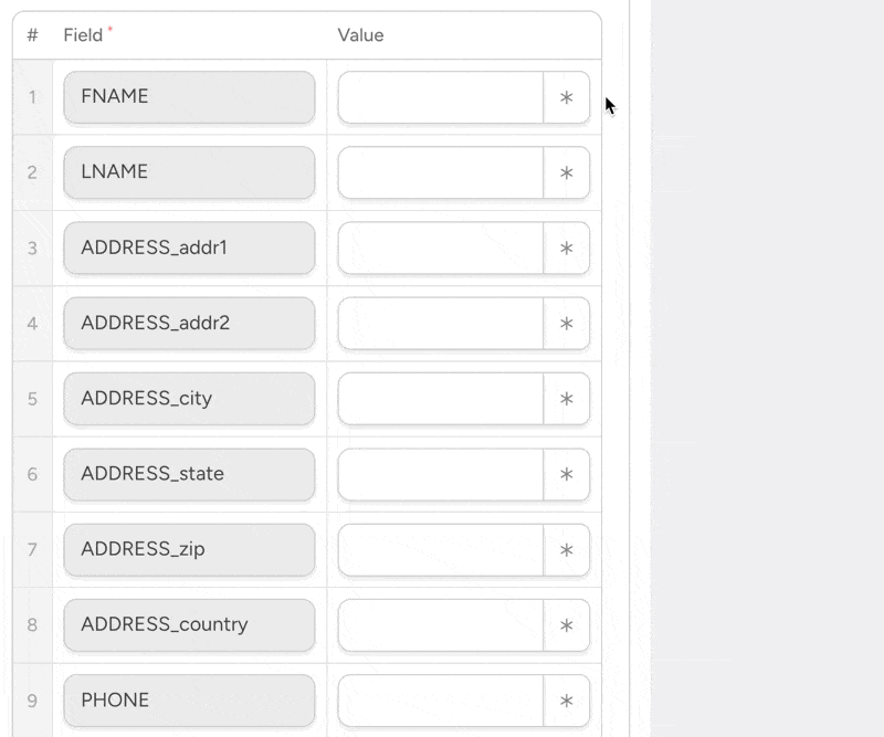 To use a token in a field, click on the Asterisk and select the corresponding token. For example, in our “FNAME” field, we have selected the token “Billing first name” from the Woo trigger.