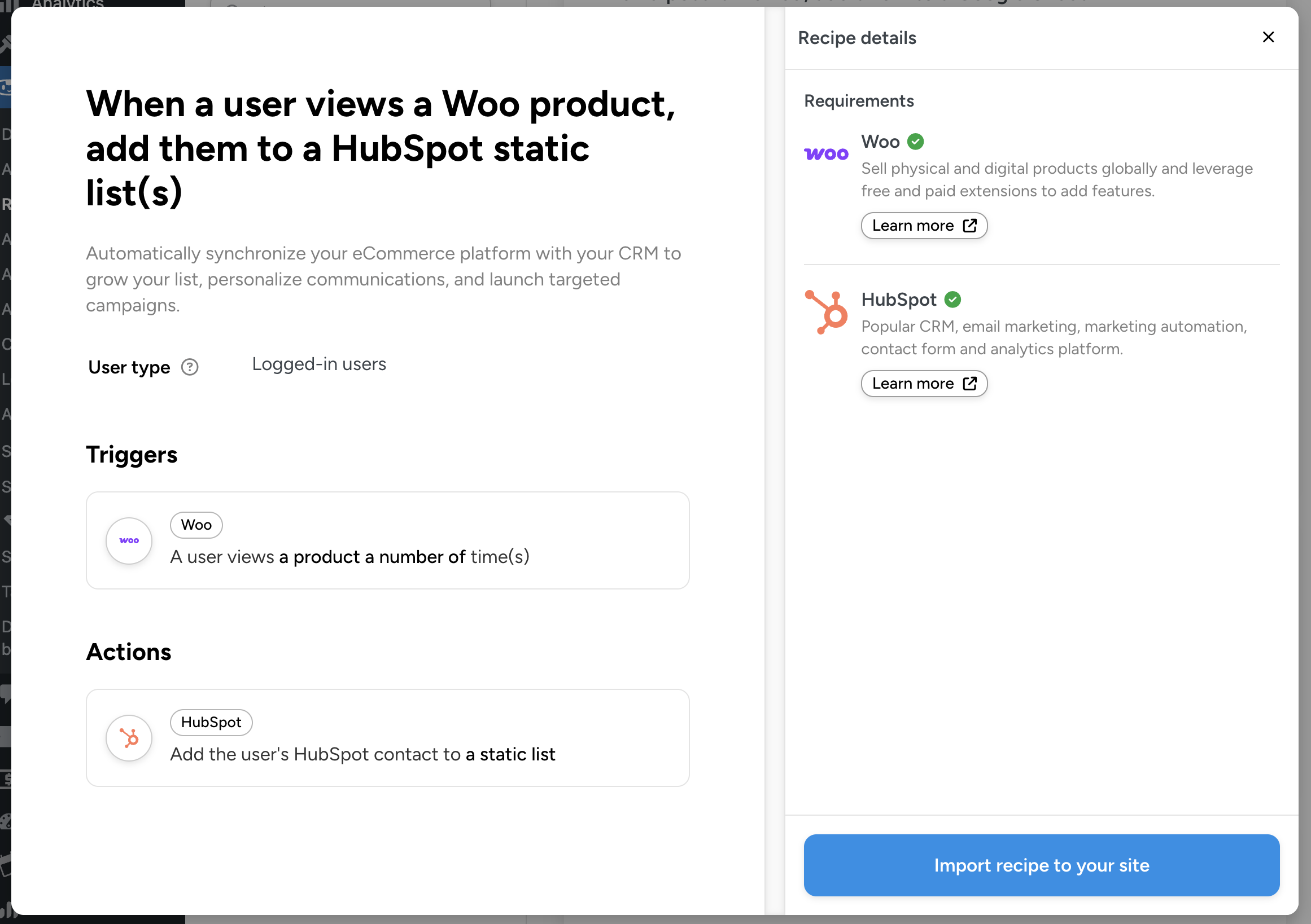 Automator recipe template modal for a recipe that adds users to HubSpot lists based on product views.