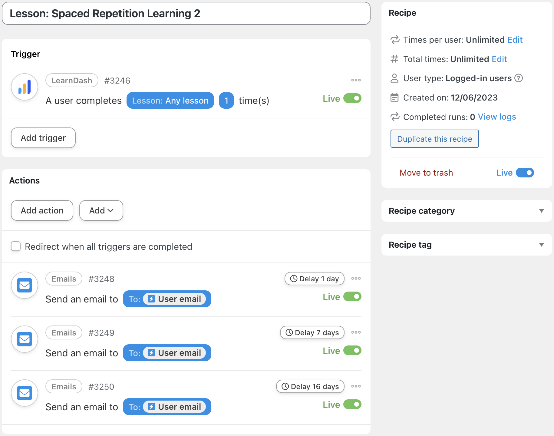 Give your recipe a name that will make it easy to recognize at a glance. For example, we’ve named this recipe “Lessons: Spaced Repetition Learning”.