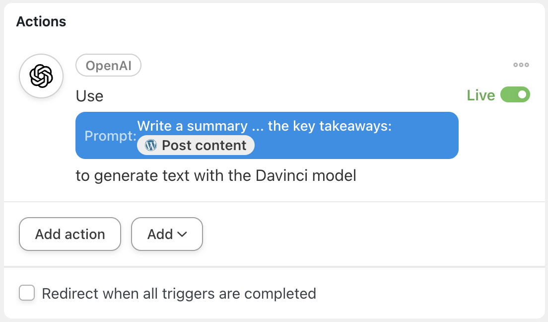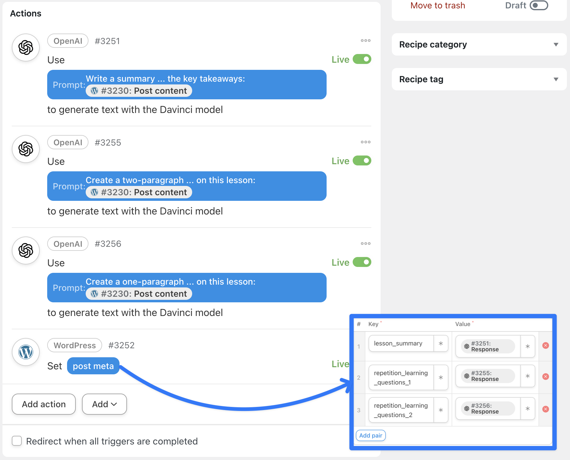 For example, we’ve created two more OpenAI actions in addition to our first one to generate different types of summaries and questions based on our lesson. We then added more key/value pairs to our post meta action to store the new content.