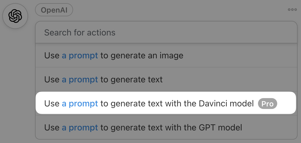 After you’ve connected your OpenAI account, from the drop-down list that appears, select Use a prompt to generate text with the Davinci model.