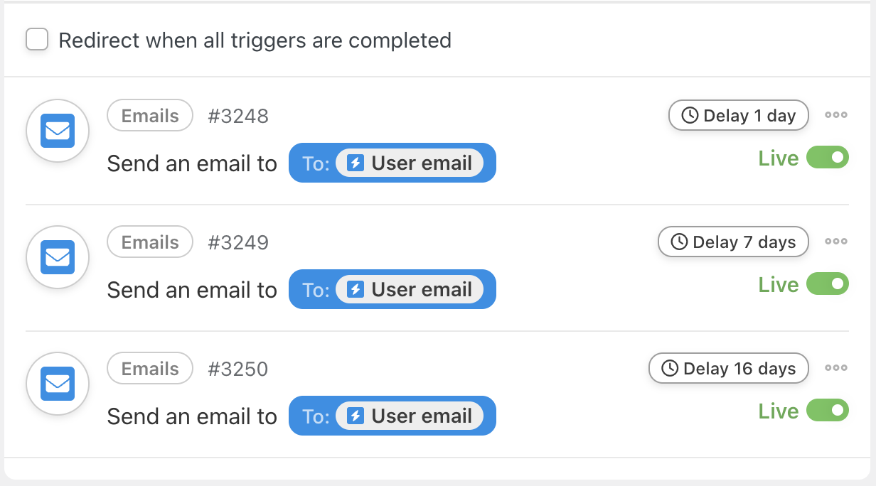 Repeat this action as many times as you want to create your spaced repetition learning schedule. For example, we’ve added two more Send an email actions with their own delays: