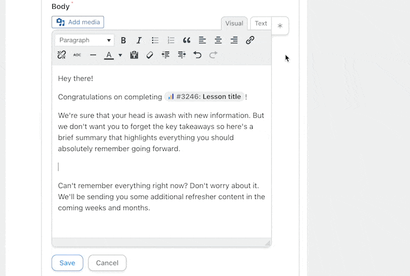 In the Body field, draft your email as you normally would. To retrieve the spaced repetition content, we’re going to use tokens once again.