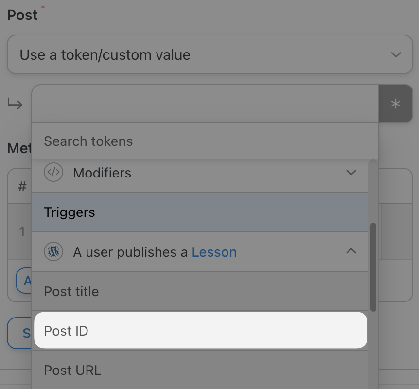 In the Token field, select Use a token/custom value and select the Post ID token under A user publishes a Lesson trigger.