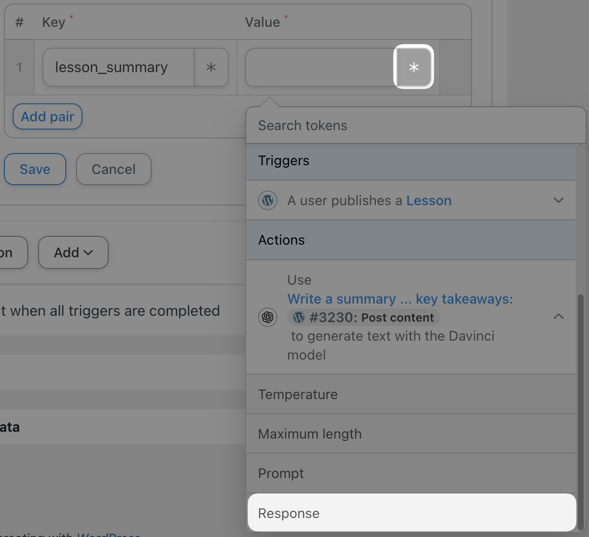 Under Meta, give your new post meta a name in the Key field. For example, we’ve named this new meta “lesson_summary”. To set the value of the new meta, select the Response token in the Value field.
