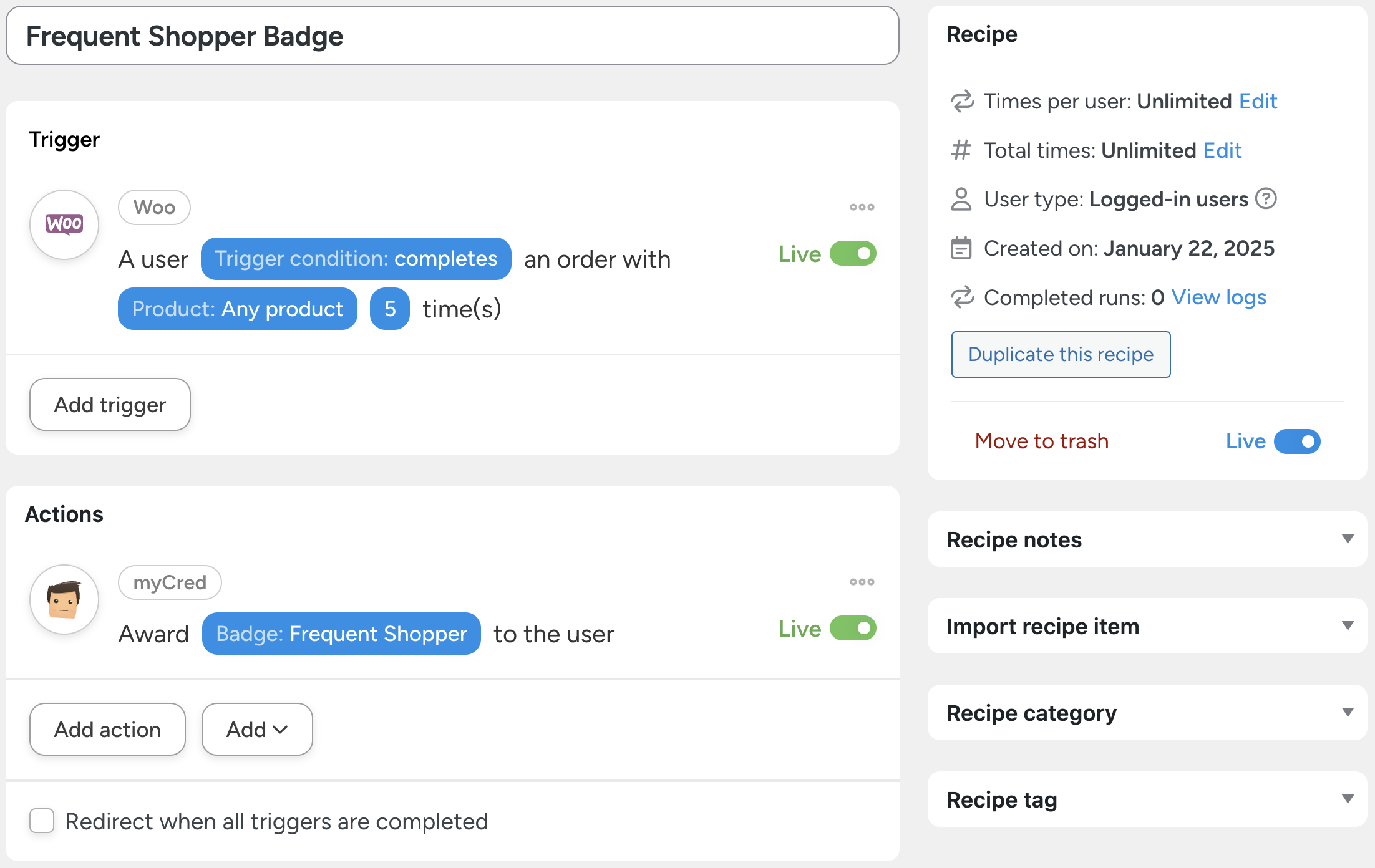 - Don’t forget to name your recipe. For example, we’ve named this recipe: “Frequent Shopper Badge”.