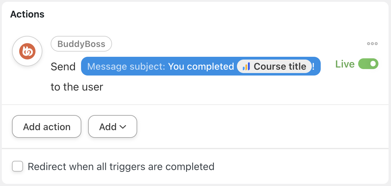 In the Actions panel, click Add action. From the menu of available integrations, select BuddyBoss.