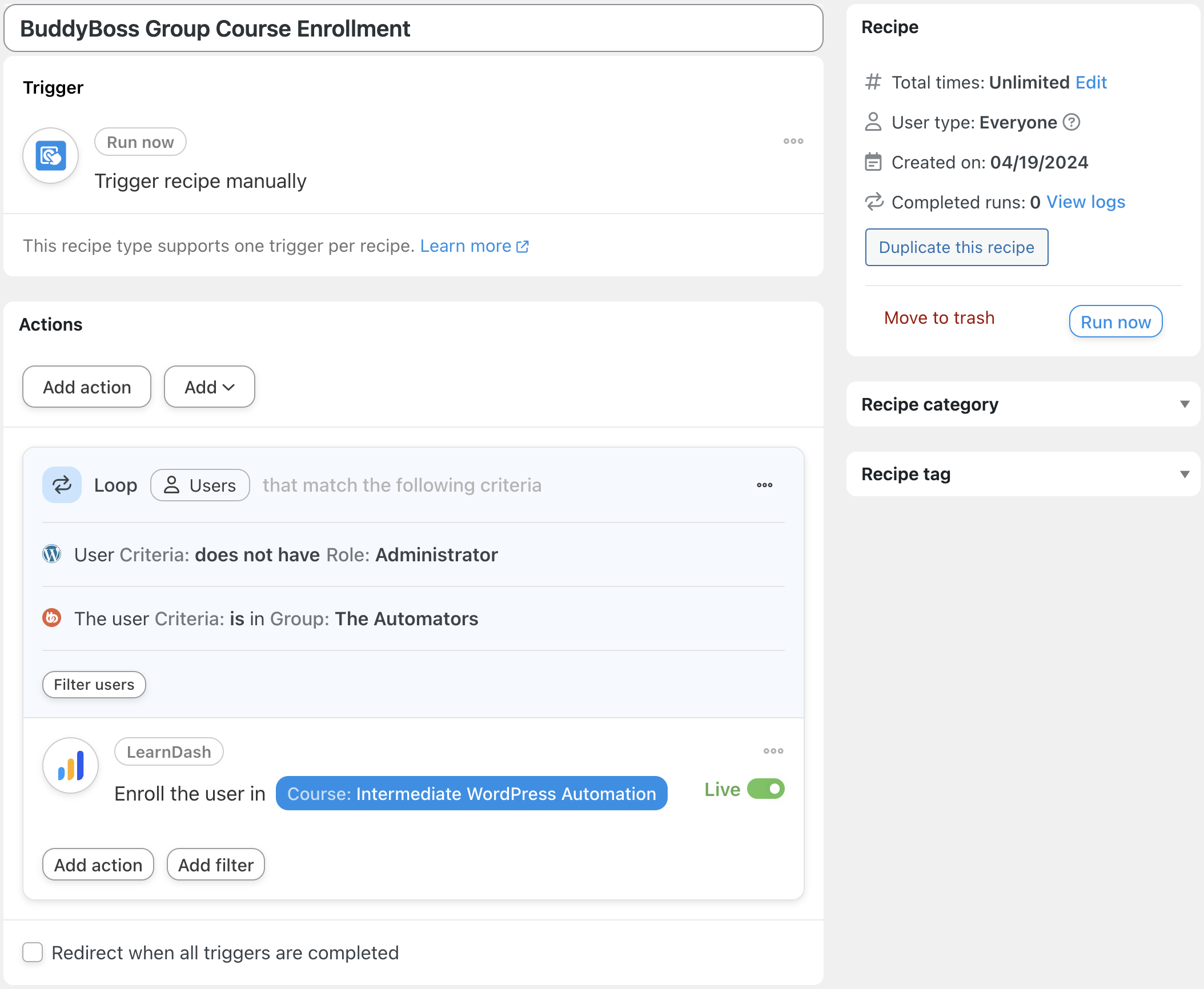 Like in the recipe pictured below, for example, where we’re able to enroll all members of a BuddyBoss group in a LearnDash course with the click of a button!