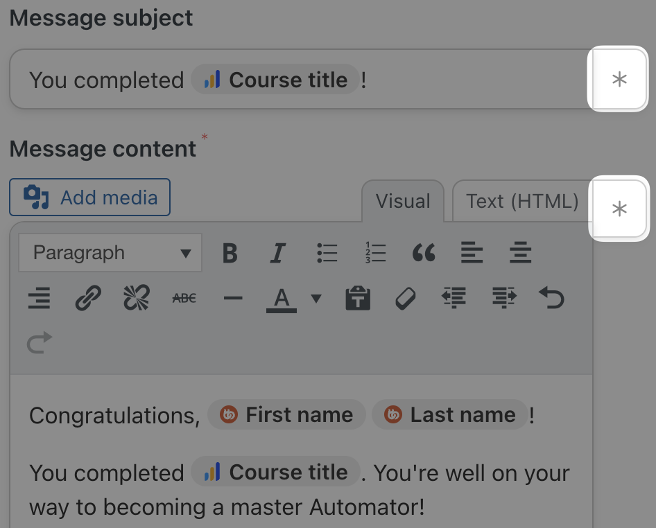 Automator will prompt you to draft the message. You can personalize the message using tokens (i.e., dynamic data pulled from your WordPress website and from within recipes). To select a token, simply click the Asterisk in any field.