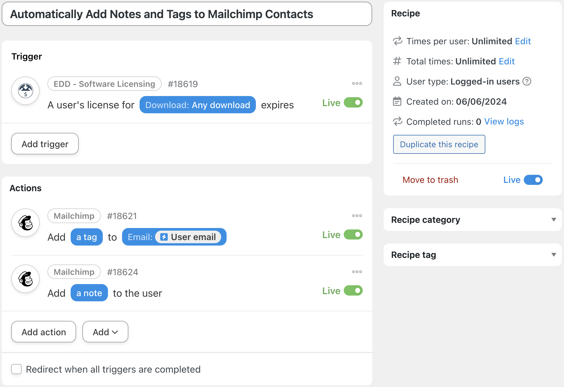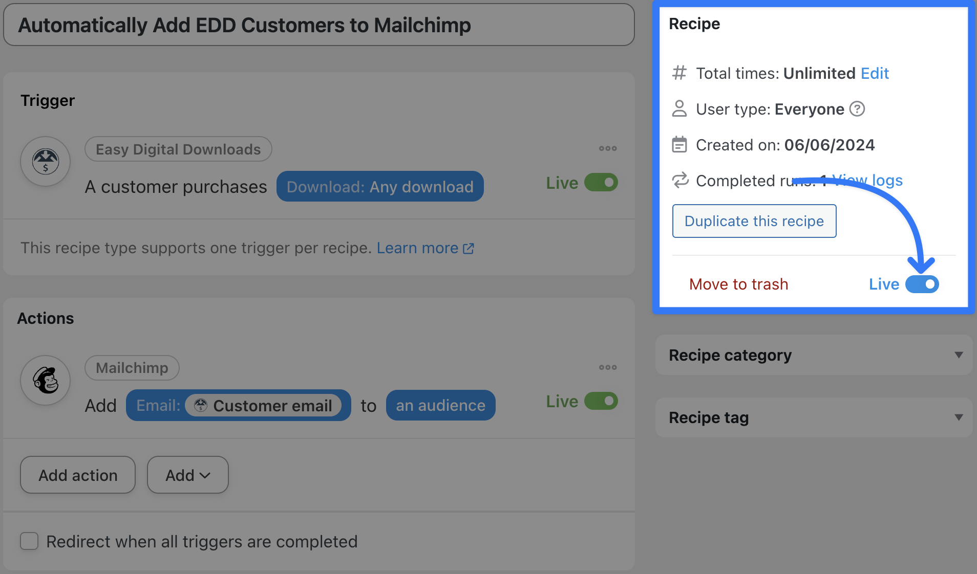 You’re just about ready to complete your first EDD and Mailchimp integration. All that’s left for you to do now is toggle the recipe from Draft to Live.