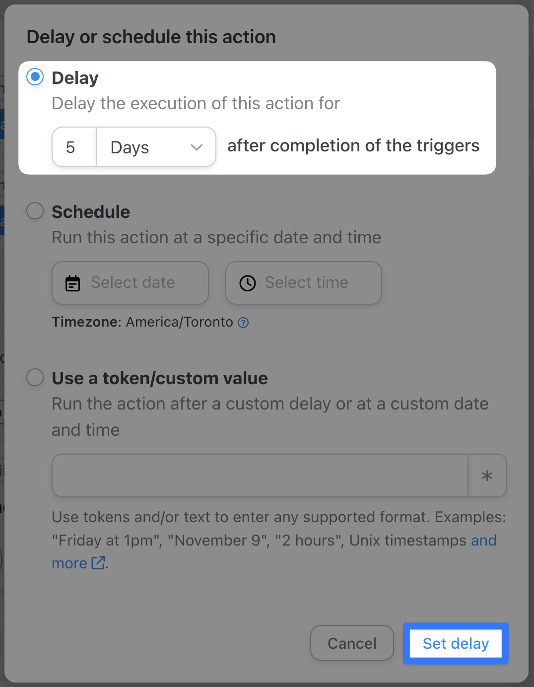 Once you’re finished, click Set delay. Altogether, your Actions panel should look like this: