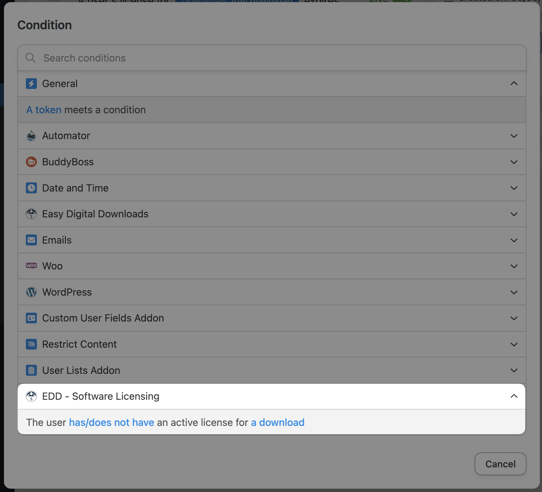 A Condition modal will appear. Select EDD – Software Licensing > The user has/does not have an active license for a download.