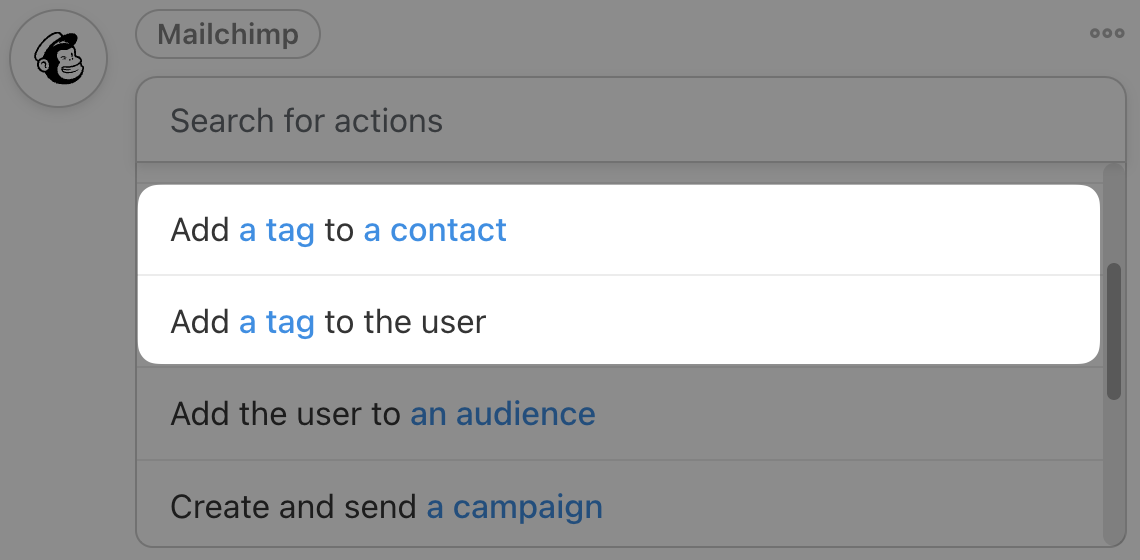 Once you’ve connected your Mailchimp account, return to the recipe editor and select Add a contact to an audience from the dropdown list.