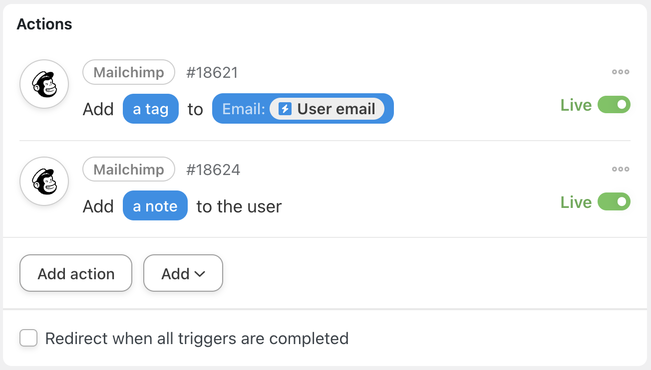 In the Actions panel, click Add action and select Mailchimp from the menu of available integrations.